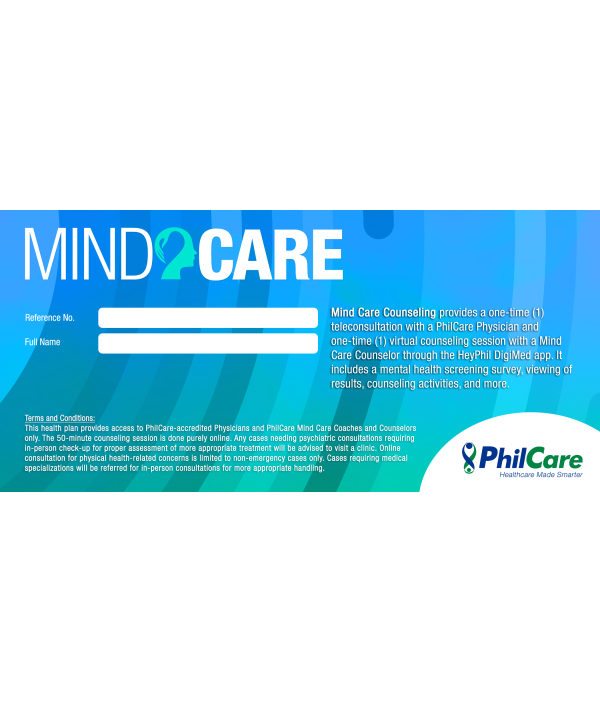 Mind Care Counseling provides a one-time (1) counseling session with a MindCare counselor through the HeyPhil DigiMed app. It also covers one-time (1) teleconsultation with a Family Medicine Specialist, Internal Medicine, or General Practitioner. One-time (1) Mental Health Assessment / Screening and Three (3) chat support with mental health associates.